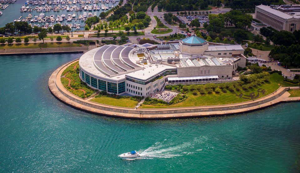 A self-guided tour may include a visit to the Shedd Aquarium, showcasing a wide variety of marine flora and fauna. The institution is housed in a monumental octagonal white marble building. The main entrance is adorned with a portico with a pediment and massive columns. The aquarium’s 4,000 m2 area consists of fascinating exhibits divided into thematic zones.