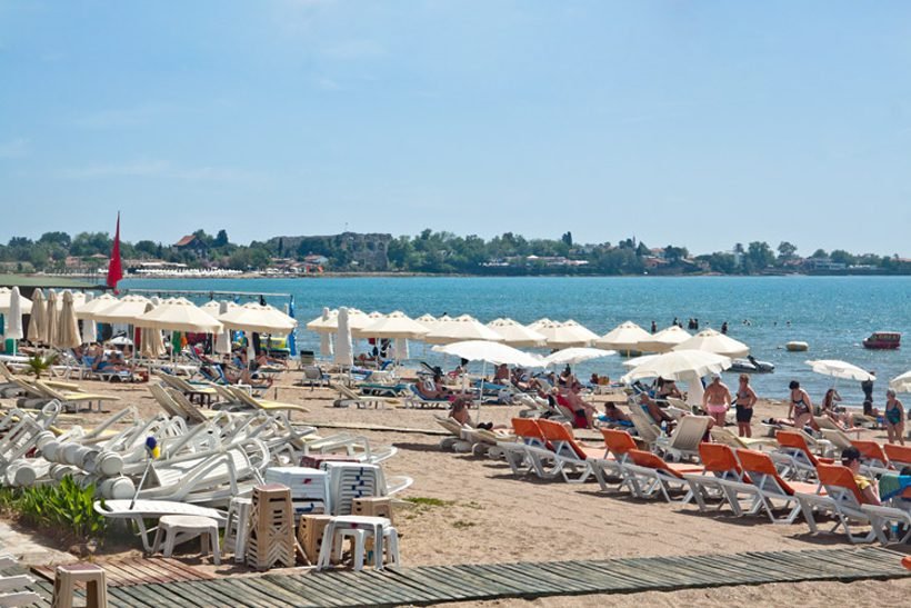 The western coast stretches for several kilometers, and its territory is divided between hotels and restaurants. The latter equip their own lounge area with sun loungers and umbrellas, which can be used by everyone for an additional fee (from 5 to 10 TL) or after paying for the order in the establishment. Renting sun beds is quite convenient, because then you can use the rest of the beach facilities, such as toilets, showers and changing rooms.