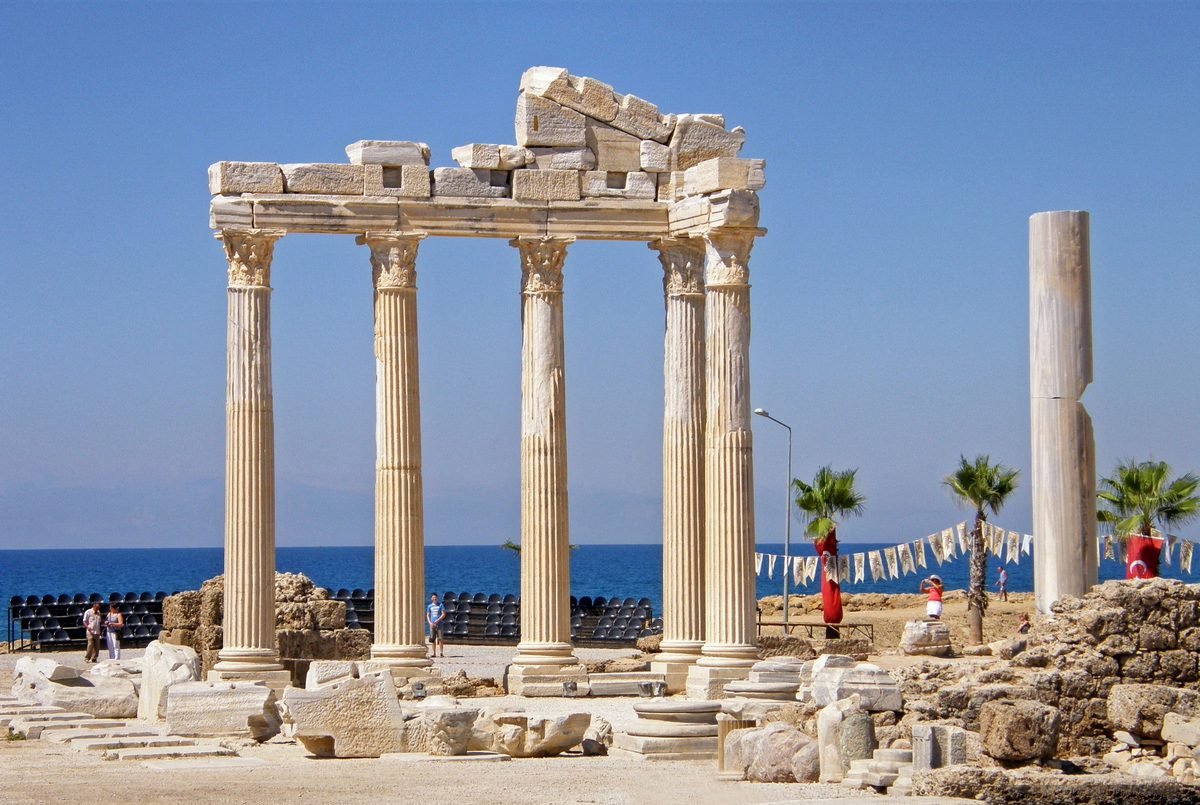 The main attraction and symbol of the city of Side was the Temple of Apollo, located on a rocky shore near the sea harbor. The monastery was built in the 2nd century AD in honor of the ancient Greek sun god and patron of the arts Apollo. The building was built for several years and was originally a rectangular building decorated with a marble colonnade. In the 10th century, during a powerful earthquake, the temple was almost destroyed. Today, only the facade, consisting of five columns, and fragments of the foundation remain from the building. You can visit the attraction at any time completely free of charge.