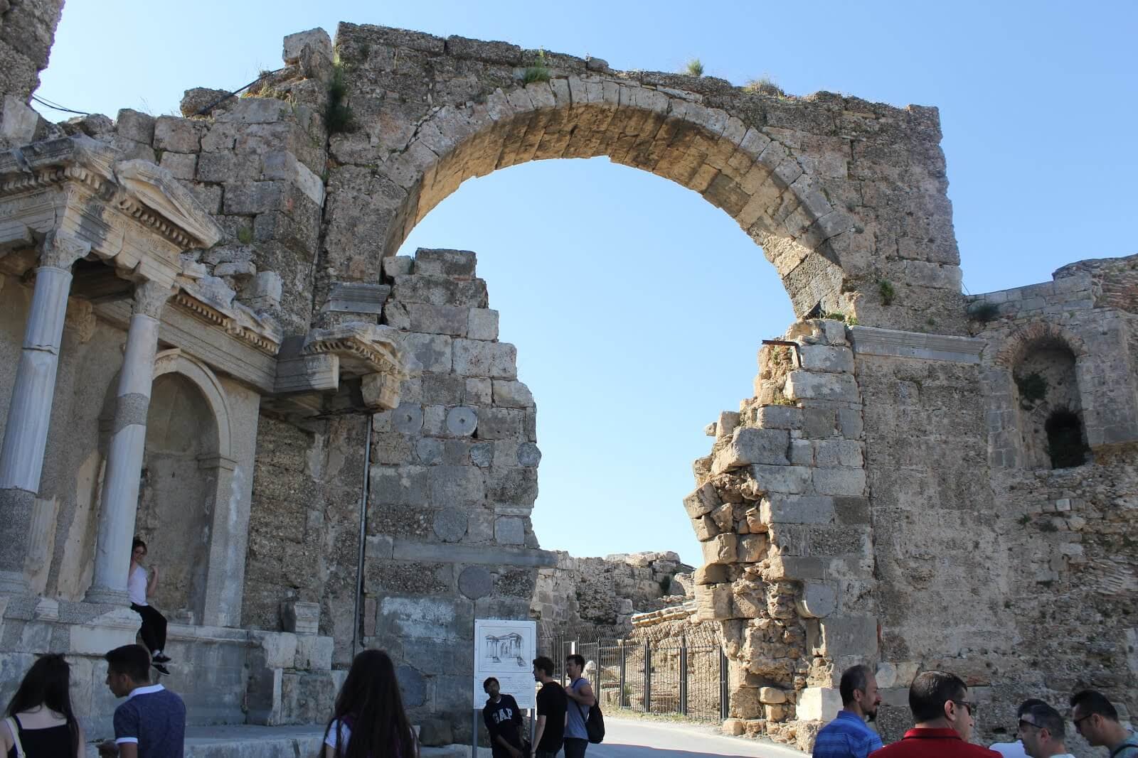 On the way to the ancient city, guests are greeted by an ancient arched gate, which is considered the main entrance to Side. The structure, dated to the 1st century AD, was erected in honor of the Roman ruler Vespasian. The height of the building reaches 6 m. Once towers rose on both sides of the gate, and the niches of the structure were decorated with statues of the emperor. Today, only ruins remain of the ancient building, but even these ruins can declare the grandeur and monumentality of the architecture of the Roman Empire.