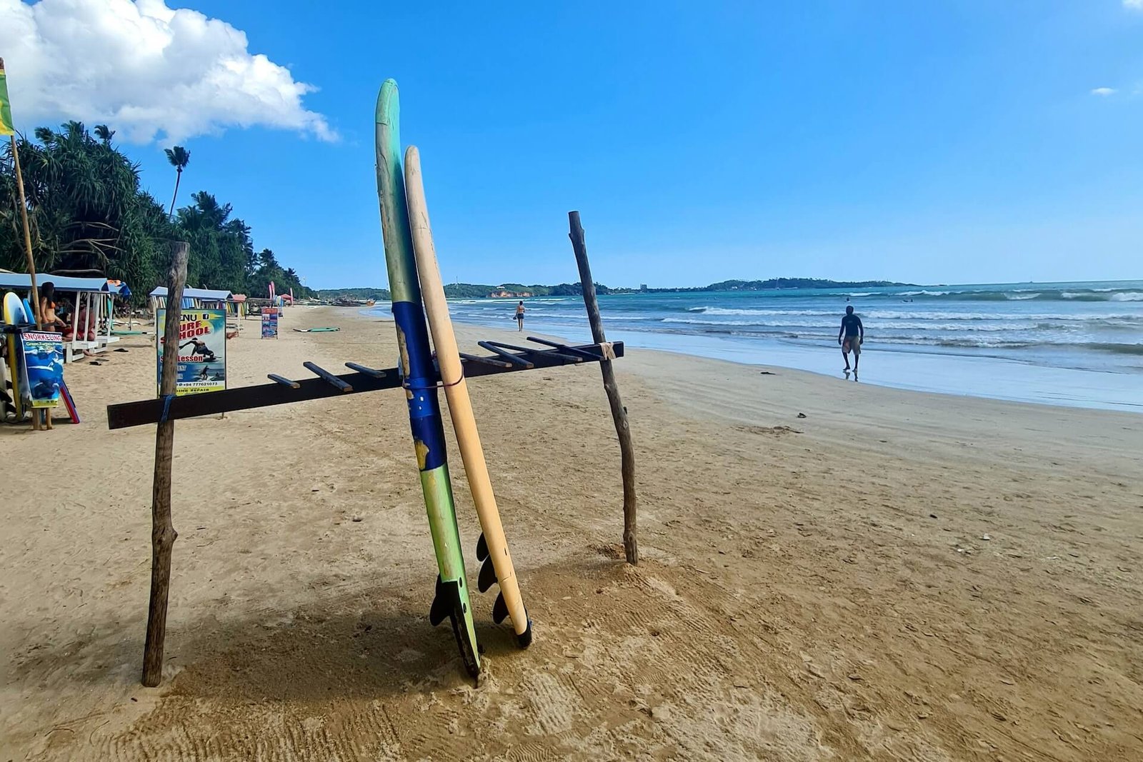 If you plan to surf in Mirissa, it’s better to choose the central part of the beach zone initially. It is specially equipped for surfers. And one more thing: avoid swimming near large boulders because there are many sea urchins whose spikes can cause severe pain if they pierce the skin.