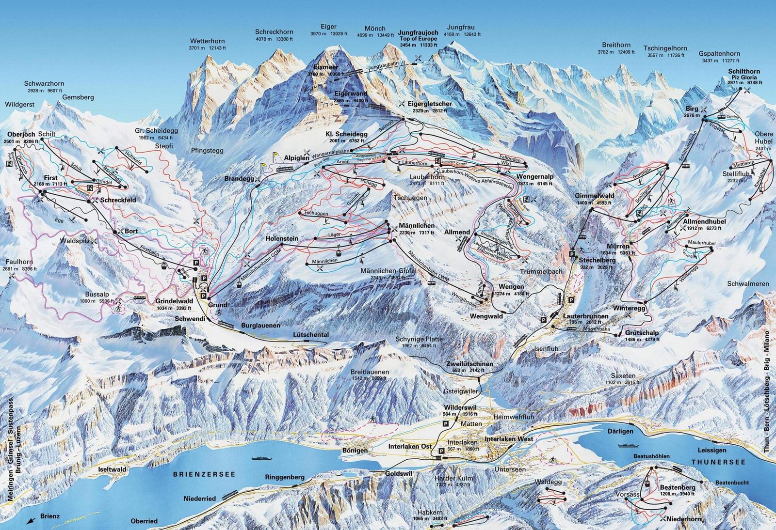 The most difficult slope is Lauberhorn – Renstrecke, the longest-from Lauberhorn to Grindelwald. The most popular route is to climb to the top of Kleine Scheidegg, descend to Wengen, climb to Menliesen, and then descend again to Grindelwald.