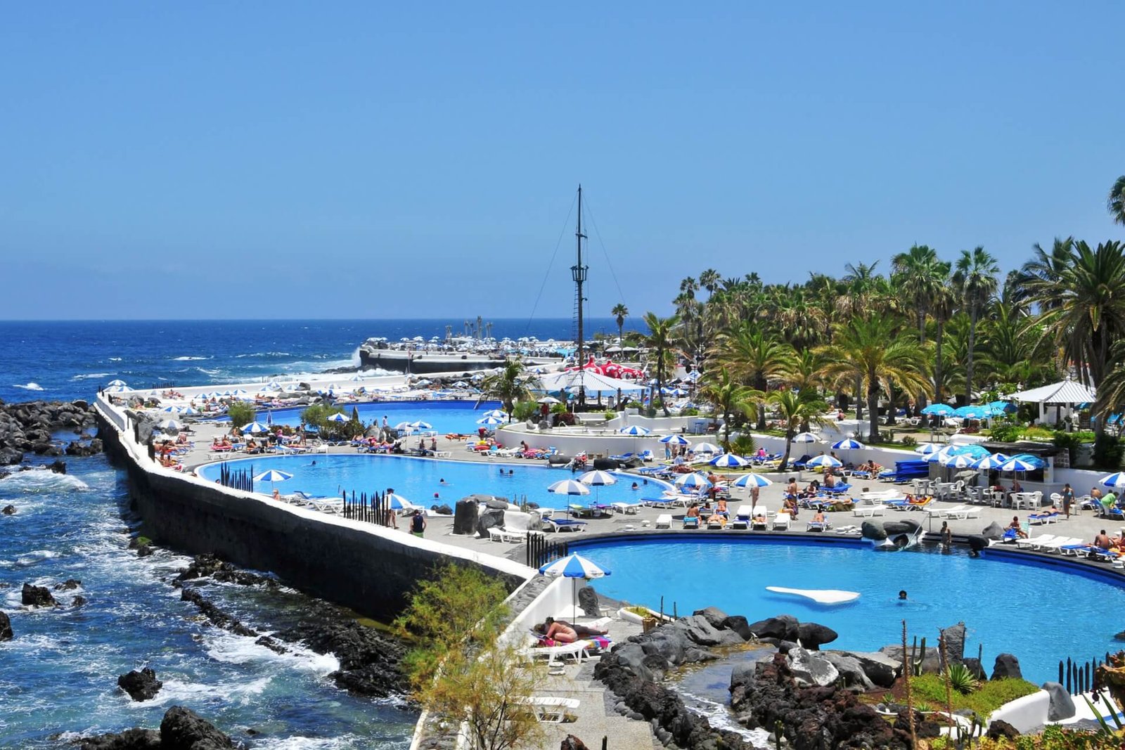 This complex consists of a system of artificial lakes on the Atlantic coast. It is located in the city of Puerto de la Cruz, in the northern part of the island. Visitors are greeted by gentle beaches, cozy cafes, dozens of pools of various diameters filled with seawater and surrounded by gardens, and even islands. The complex opened at the end of the 20th century, but back then it included only two pools. One was for children, the other for adults.