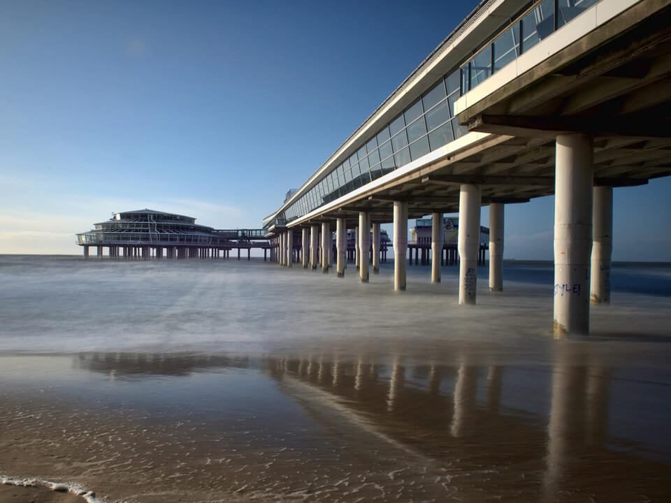 In the Scheveningen district, considered the best resort in the Netherlands, stands the pier of the same name. This is the second pier built here; the first, constructed in 1901, was destroyed during World War II as it was used by the Germans for ammunition storage. In 1959, construction of the 380-meter modern pier began, a favorite among tourists and locals. It features two levels: a glass-enclosed lower gallery and an open upper deck. The pier serves as a promenade, viewing platform, and a shopping and entertainment space.