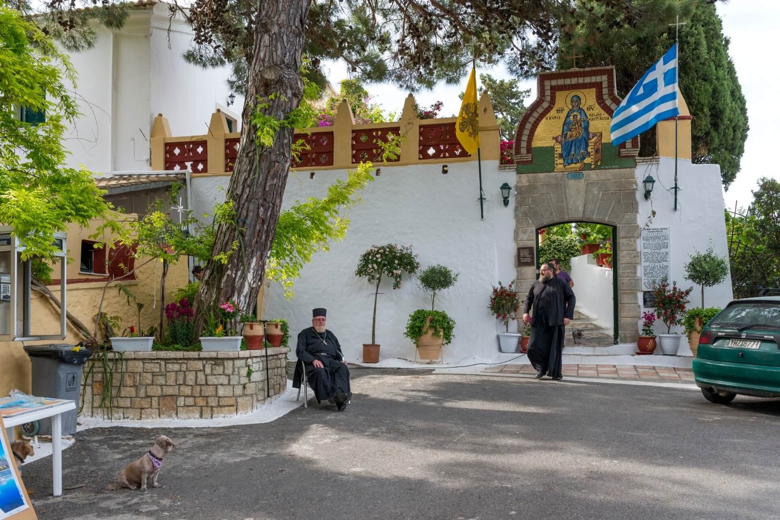 Everything here speaks of the monks’ careful love for their monastery: the immaculate cleanliness of the courtyard, the beautiful flowers, the well-kept garden, and the vineyard. A wonderful arched courtyard, decorated with climbing bougainvillea and mosaic panels, leads to the monastic cells. The monastery has a small olive oil factory, where visitors can buy oil at a low price.