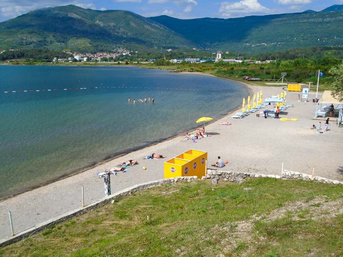 This half-kilometer beach is an island of peace and beautiful nature at the southern entrance to the city, close to the airport. It is also part of the cypress grove and the former Bizanti Palace Park. This allows vacationers to sit in the shade of the seaside needles and often do without umbrellas. From the elevation of the palace park, you can see the neighboring islands, the mountains of the Boko Kotor Bay and enjoy a panoramic view of Tivat from an unusual angle.