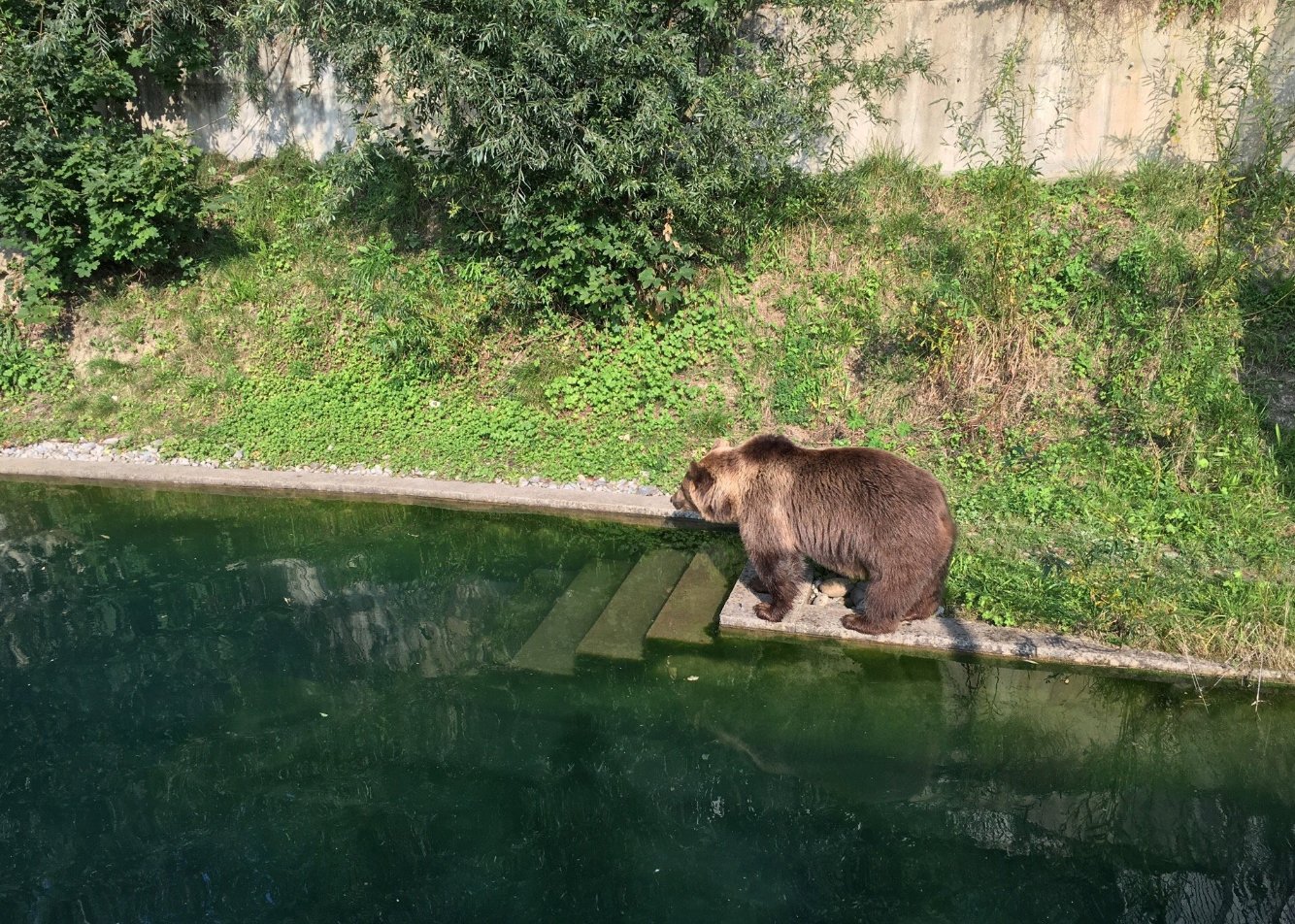 An area has been prepared for the bears, where they can fish, play, and climb trees. The modern bear property stretches from the old pit to the Aare River and is located opposite the old town of Bern. The old pit is connected to the city park by a tunnel.