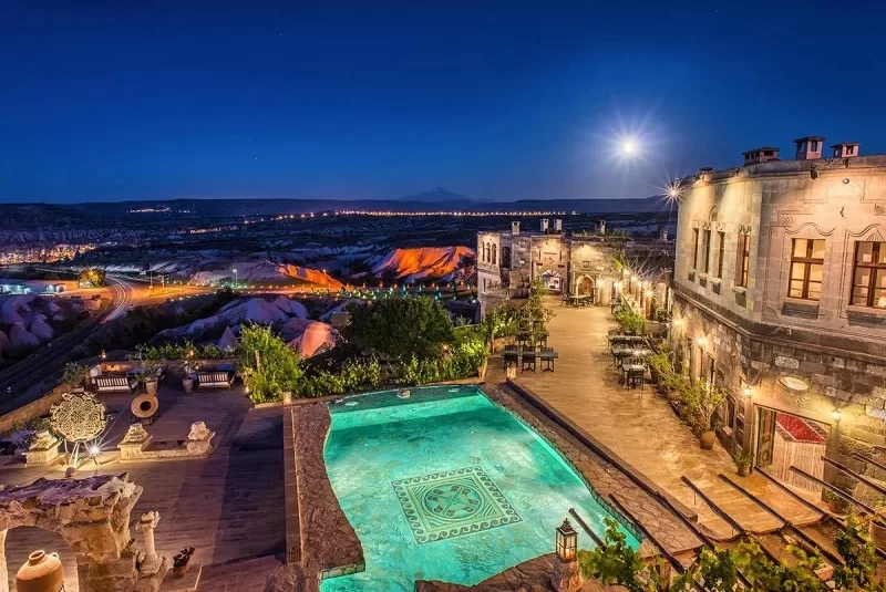 The five-star Dinler resort offers everything necessary for a comfortable stay. It is located in the busiest part of Ürgüp, near a small and excellent winery. From the balcony of their rooms, guests can enjoy unparalleled views of the unique town. The resort complex also features a garden covering 20,000 square meters. Guests are provided with comfortable rooms, a gym, a sauna, and for an additional fee, memorable hot air balloon rides.