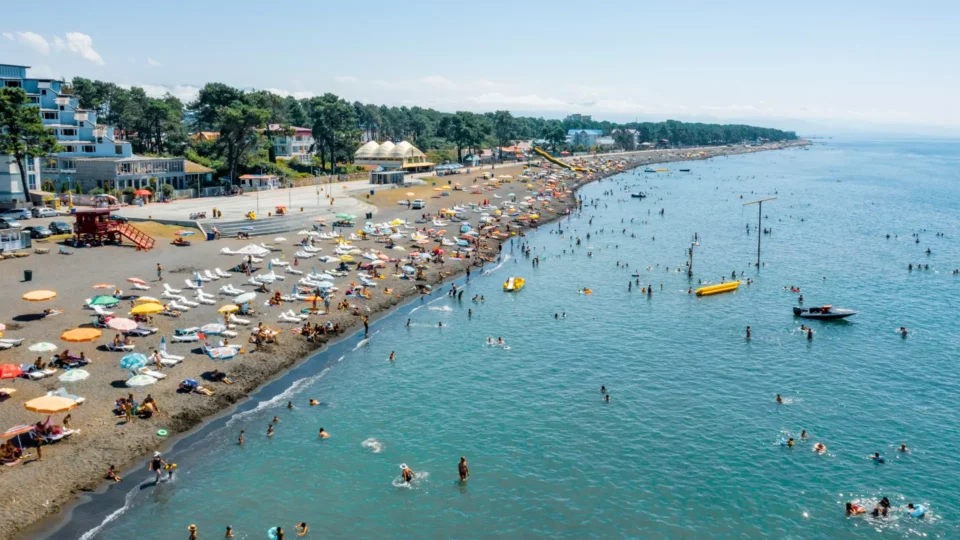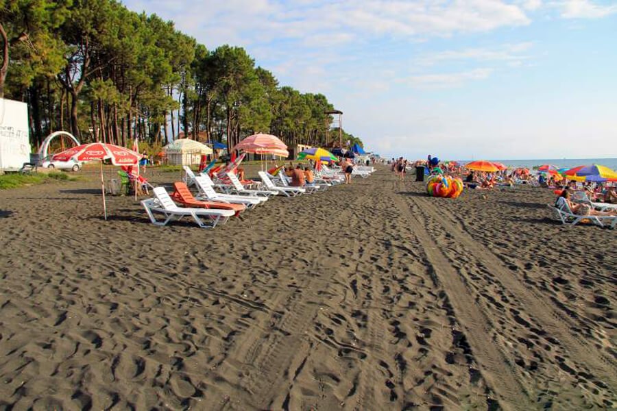 Two-kilometer Ureki beach is located on the Black Sea coast in Georgia. This is a place for the whole family to relax. The water in the sea is clean. The width of the sand strip is about 30 m, the entrance to the water is gentle — you need to walk 60-80 meters to the depth. In the photo of the Georgian Ureki, you will see that a large pine forest grows around the village.