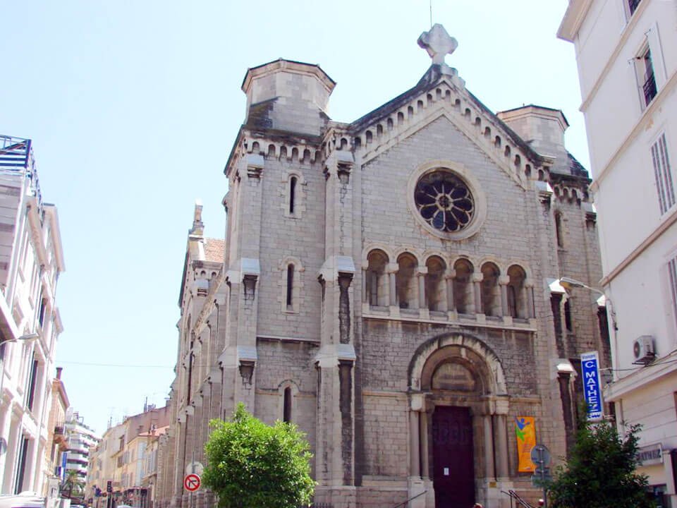 Gray stone was used for its construction. Architect Laurent Viane adhered to a strict Neo-Romanesque style. But funds were scarce. So the bell tower and two more towers were never built. Inside the church, you can see very beautiful stained glass windows. It was in this church that many noble people who lived in Cannes were married and buried.