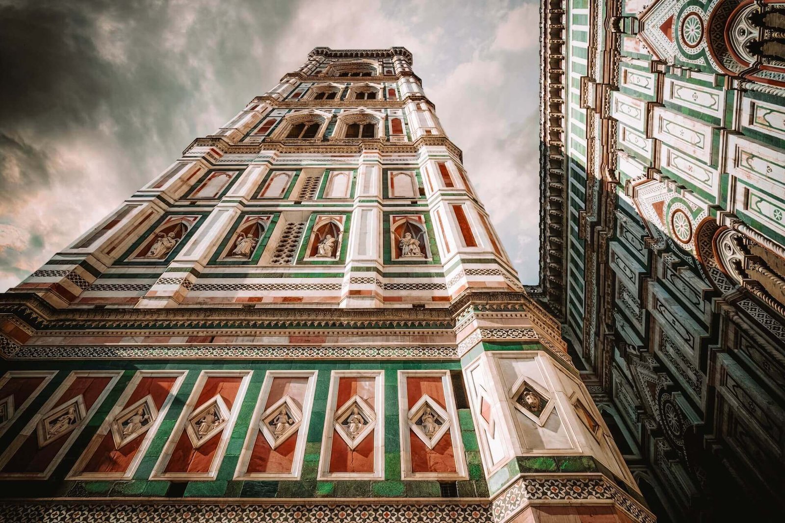 Visitors climb the bell tower to enjoy views of Piazza del Duomo, the Santa Maria del Fiore Cathedral, the Baptistery, and the picturesque city surroundings against a backdrop of green hills. The Campanile’s facades and interiors are adorned with artworks by renowned artists and sculptors.