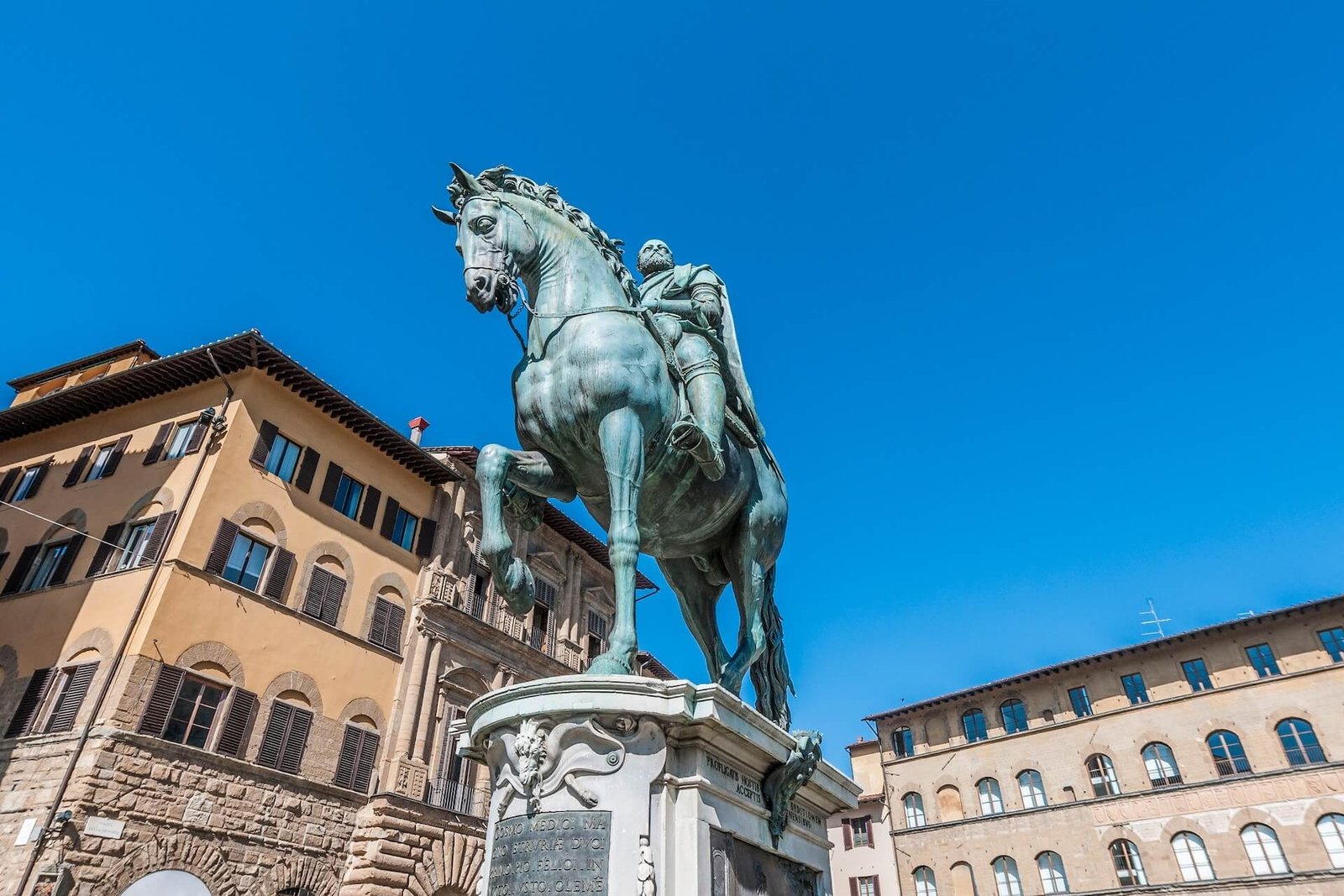 The equestrian statue of Cosimo I by sculptor Giambologna was installed in 1594. Contemporaries noted the resemblance between the Grand Duke of Tuscany and Emperor Marcus Aurelius, whose monument is in Rome.